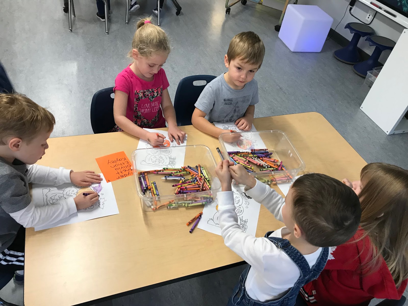 New learning tables have taken on a Halloween theme this week. Students will represent the numbers 4, 7, 9 and 10 by creating pumpkins on a vine using fingerprints. Students will recognize the numerals 1 -5 and follow a colouring guide to colour a haunted house. Using Halloween pictures, students are extending two and three element patterns. Students are working on their proper pencil grip and fine motor skills to colour a jack-o-lantern picture. Using their colouring rubric will help them create a masterpiece.